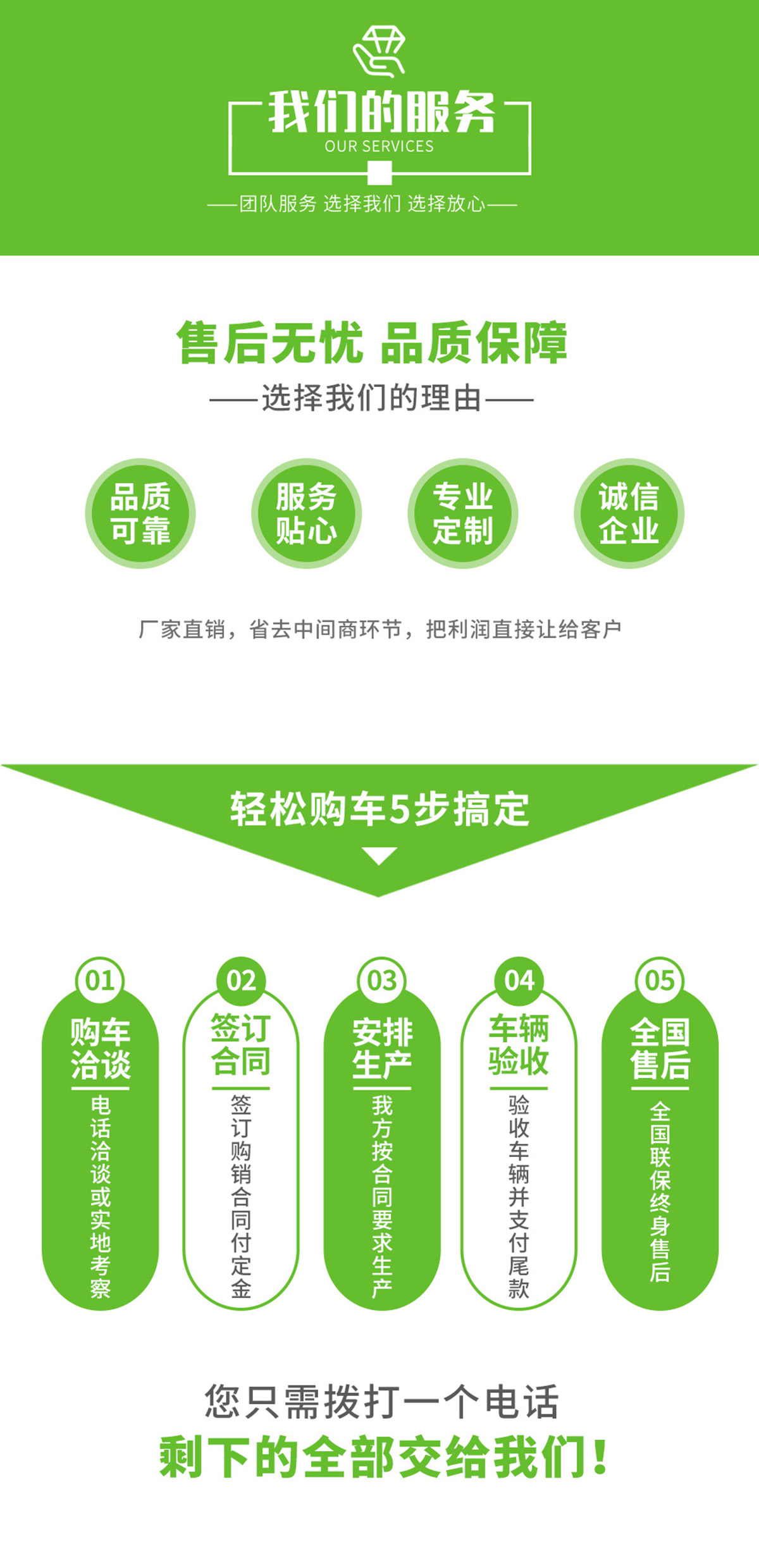 ·創(chuàng)優(yōu)質服務企業(yè); 造用戶滿意產(chǎn)品; 樹國內(nèi)知名品牌!公司堅持以“質量求生存、信譽求發(fā)展、科技創(chuàng)新路、服務創(chuàng)品牌”的經(jīng)營理念,以“誠信、務實、創(chuàng)新、進取”為企業(yè)宗旨,不斷提升自身產(chǎn)品質量,開發(fā)適應市場需求物美價廉的多功能專用汽車! 我們將謁誠為您提供更好、更快、更優(yōu)質的服務!