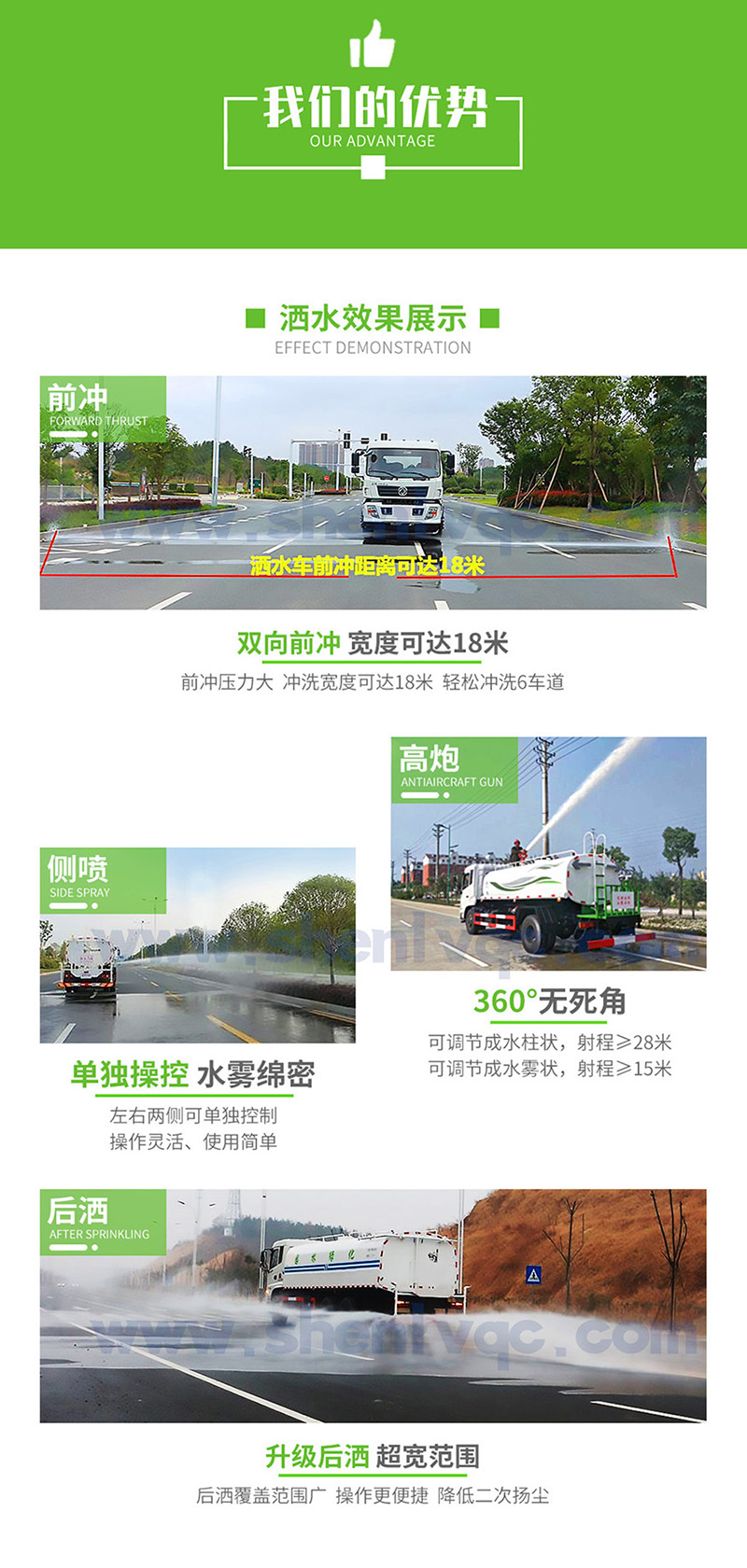 常規(guī)功能:前沖、后灑、側(cè)噴、灑水高炮、消防接口