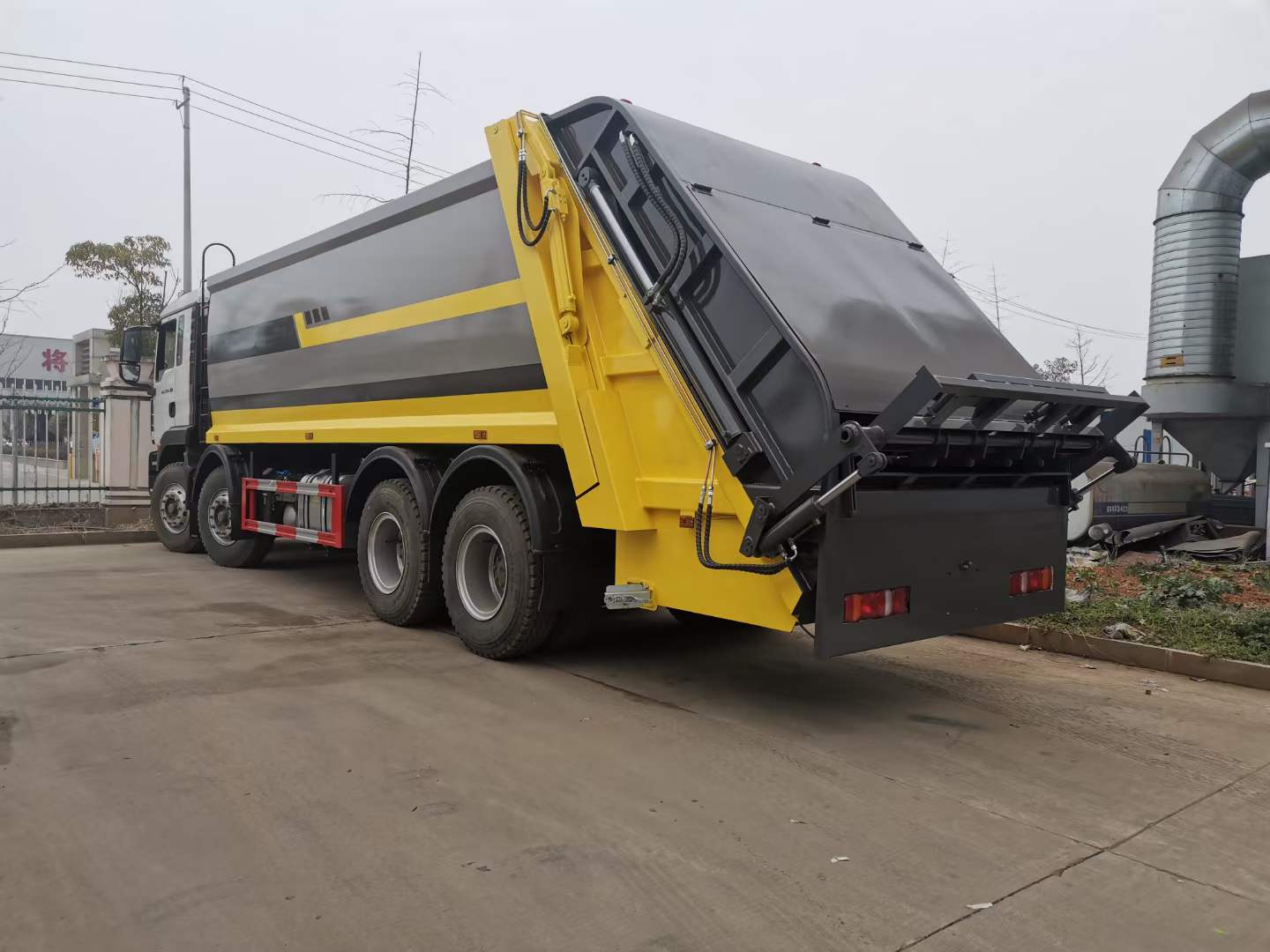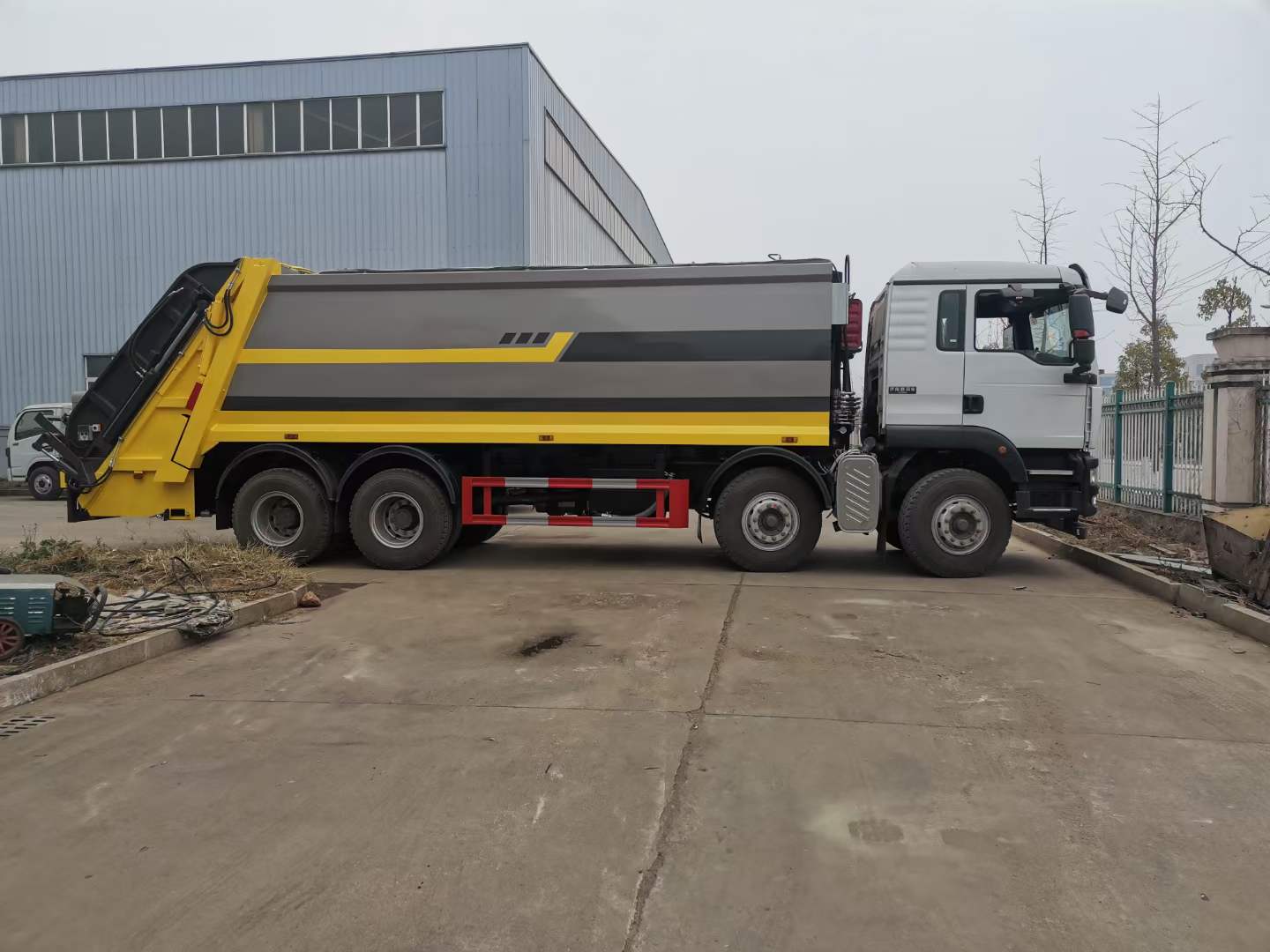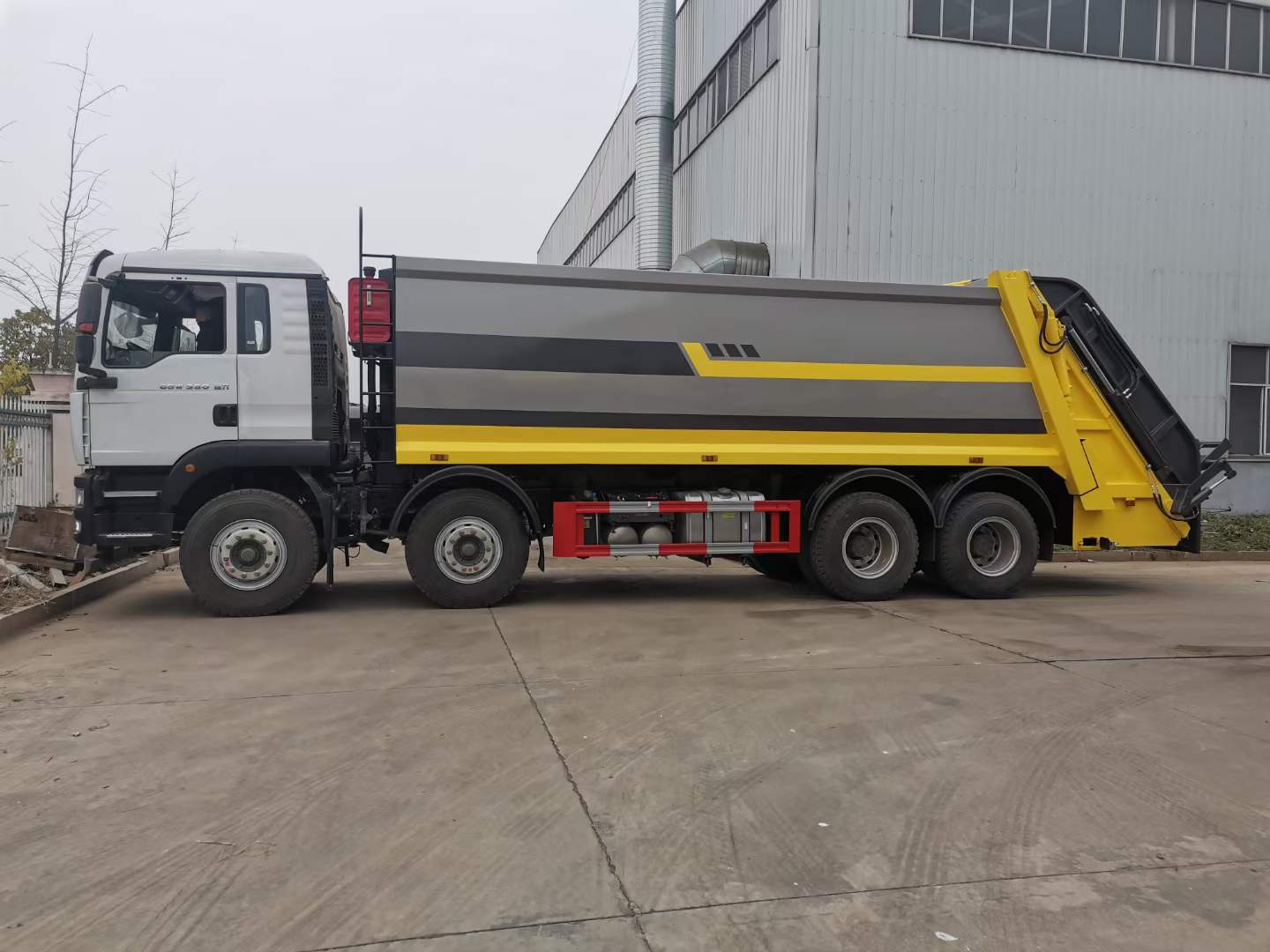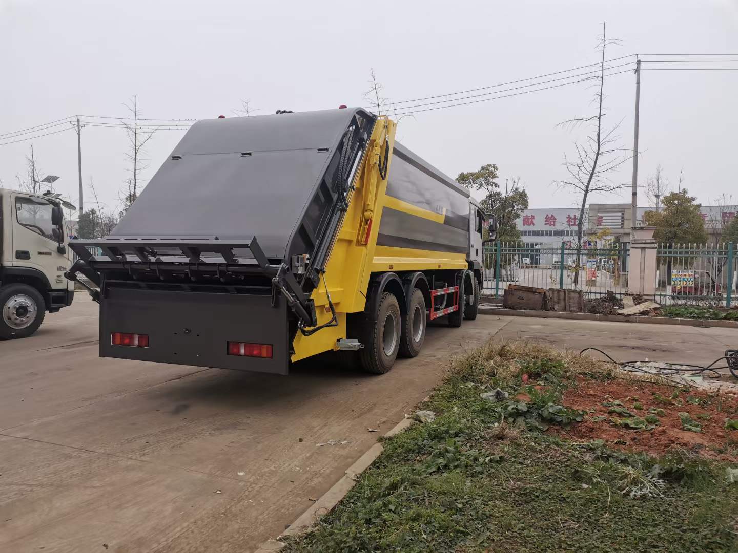 底盤配置: 配置一:濰柴350馬力,G5-M系列駕駛室,軸距:1800+3800+1350,豪沃10檔變速箱,5.5噸前橋,11噸雙后橋,280大梁,11.00R20鋼絲胎,400L油箱。自動空調(diào),四通道ABS,博世方向機,氣囊座椅,電動玻璃,中控鎖,搖控鑰匙,可調(diào)節(jié)多功能方向盤,電動調(diào)節(jié)帶加熱后視鏡。(換12檔變速箱,16噸輪邊減速橋加8000) 配置二:德國曼350馬力,G5H-W駕駛室;HW19710變速器+HW70法蘭式取力器;H653自調(diào)臂前軸(6噸鼓式);MCJ11沖焊自調(diào)臂雙后橋(曼11噸鼓式);雙層車架(8+4/280);ZF8198方向機;前后標準版多片簧(11/11/10);中位保險杠(金屬);帶ABS(4S/4M);標準版排氣系統(tǒng);無氣候包。11.00R20;速比4.63;選裝前后螺旋簧懸置;選裝300L油箱;選裝整車前下防護;選裝中國重汽智能通A版 上裝配置:1,新款弧形箱體,增加箱體容積,整車更美觀,箱體為碳鋼制作,底箱及填充器采用加厚鋼板,耐腐蝕使用壽命長,一層油漆噴涂處理。2,裝載循環(huán)時間=25S;垃圾排出時間≤25S;填料提升角度≥95°,壓縮比例為1/3-1/2,一裝部分具備雙向壓縮和蠕動壓縮功能帶。3,新款結(jié)構(gòu)加大填充器,手電一體操作模式,帶駕駛室操作,帶駕駛室一鍵卸料功能,3308軸距以上配遠距離遙控器,尾部裝置可以選裝垃圾翻轉(zhuǎn)斗,掛桶翻轉(zhuǎn)板或者大落地斗。4,CAN總線控制方式,光電開關(guān)加延時雙系統(tǒng)控制,降低故障率,方便維修。5,帶夜間照明裝置,6方)及以上車型帶雙污水箱,污水箱排水球閥和排水蓋,增加排水管,防止濺水,人性化設(shè)計。6,標配選用:威森搏樂油缸,威森搏樂多路閥,3308軸距以上配備壓實閥(背壓閥),所有車型標配單泵。5000軸距、后八輪車型標標配雙聯(lián)泵,大油量多路閥。 選裝配置:大落地斗,帶后擺臂,另帶單一掛桶裝置,尾部密封蓋手動/氣缸控制,雙聯(lián)泵(多路閥聯(lián)數(shù)增加,液壓泵加大,液壓油箱加大) |